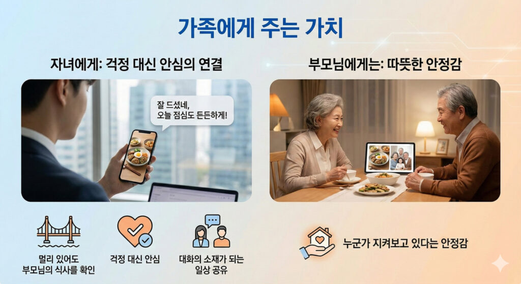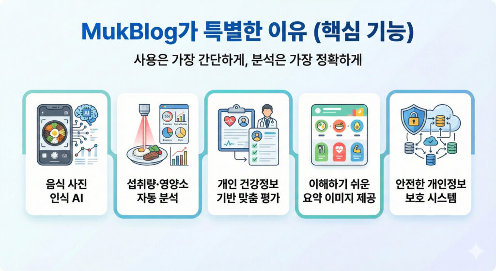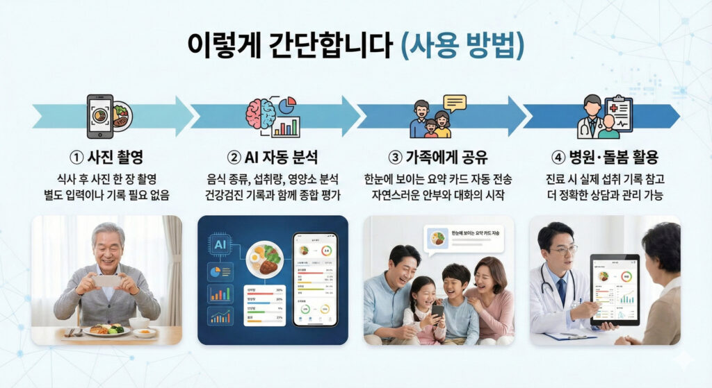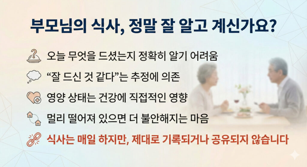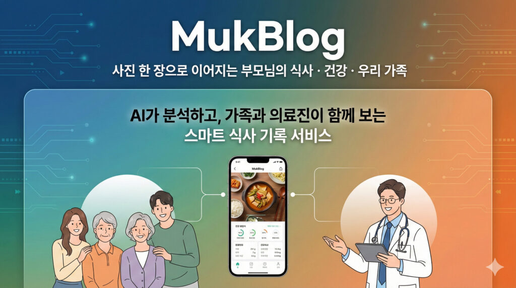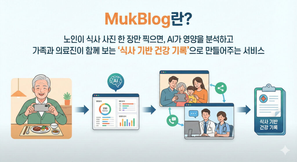 부모님의 식사는 하루 중 가장 중요한 건강 신호이지만, 정작 우리는 그 내용을 정확히 알기 어렵습니다. 오늘 무엇을 드셨는지, 잘 드셨는지에 대한 질문은 늘 “대충”의 답으로 돌아오기 마련이고, 그 사이 식사는 기억 속에서 사라집니다. MukBlog는 이 일상적인 불안을 한 장의 사진으로 바꾸는 서비스입니다. 노인이 식사 사진을 한 번 찍기만 하면 AI가 음식 종류와 섭취량, 영양소를 분석하고, 그 결과를 가족과 자동으로 공유합니다. 복잡한 기록이나 입력 없이도 부모님의 식사 상태를 한눈에 확인할 수 있고, 이러한 식사 기록은 병원 진료 시에도 객관적인 건강 정보로 활용될 수 있습니다. MukBlog는 단순한 식사 기록 앱이 아니라, 하루 한 끼를 통해 부모님의 건강을 지키고 가족의 연결을 회복하는 새로운 방법입니다.